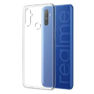 Slim clear TPU case for Realme C3 with shockproof corners and raised screen protection.